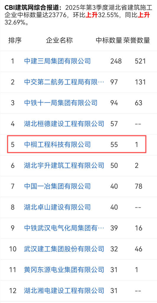 CBI建筑网综合报道:2025年第3季度湖北省建筑施企业中标数量达23776,环比上升32.55%,同比上升32.69%。中榈工程科技有限公司(中建国信)中标数量跻身全省5强。