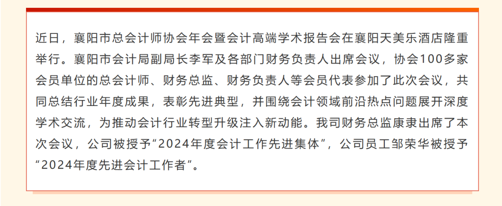 同时,作为襄阳市总会计师协会的重要一员,我们也将积极履行会员单位职责,主动分享公司在会计工作中的实践经验,加强与行业内其他企业的交流合作,与各位同行携手共进,共同推动襄阳市会计行业的转型升级与创新发展,为区域经济高质量发展贡献中榈力量!