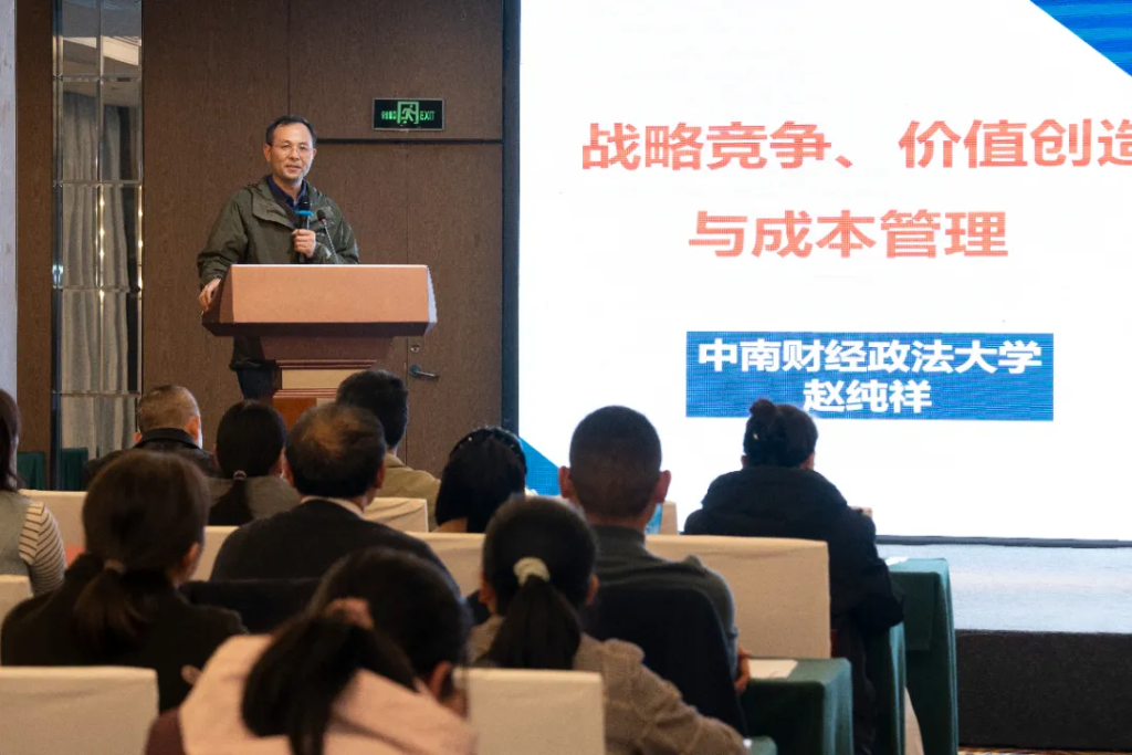首先是中南财经政法大学会计学院赵纯祥教授作《战略竞争、价值创造与成本管理》专题报告,赵教授主要从文明竞争背后隐秘的成本逻辑、成本认识的三重境界、企业价值成长与成本密码、战略竞争与成本设计四个方面,如同构建了一幅完整的战略地图,层层递进,揭示了现代企业竞争的本质,即成本不再是财务数字,而是企业战略的凝结、是商业模式的骨架、是核心竞争力的密码。