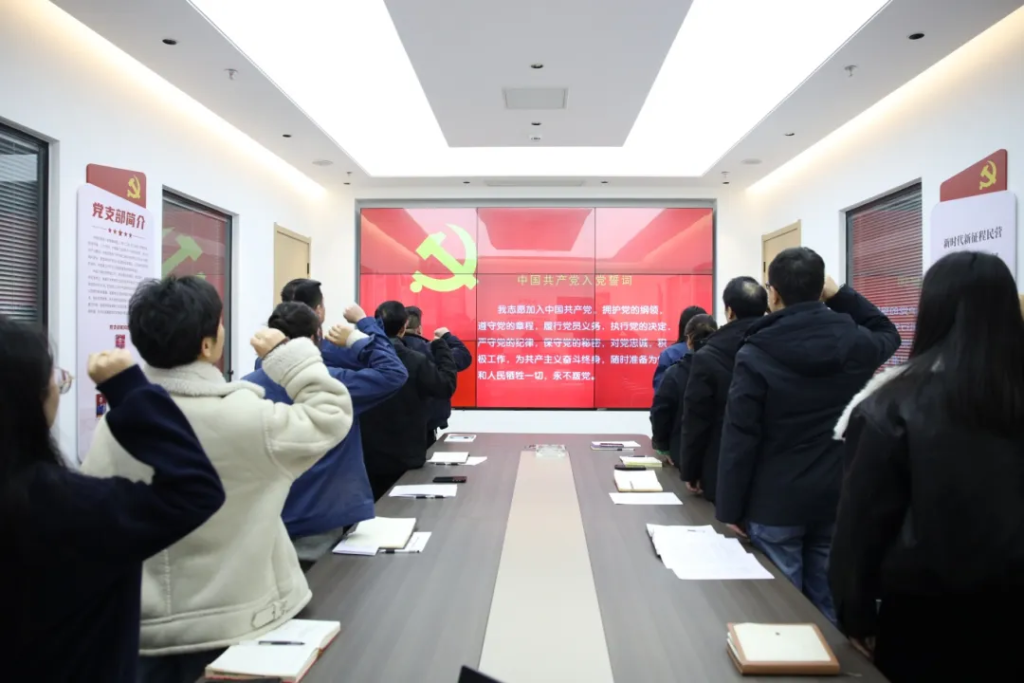 活动在庄严的《中华人民共和国国歌》声中拉开序幕,全体参会人员肃立致敬,激昂的旋律凝聚起奋进力量。随后,中榈科技执总、党员王丹妮同志带领全体党员面向党旗,举起右拳庄严宣誓,重温入党誓词。铮铮誓言铿锵有力,既是对入党初心的回溯坚守,也是对新时代责任担当的郑重承诺,进一步筑牢了全体党员的理想信念根基。