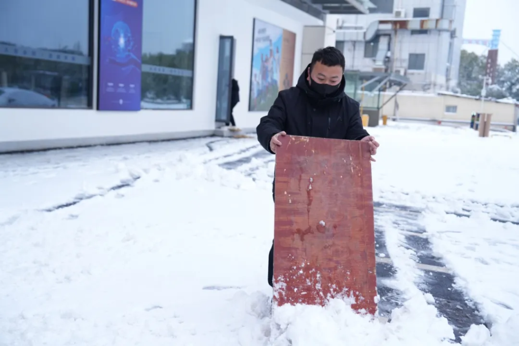 青年志愿者们在本次行动中展现了蓬勃的朝气与创造力。以王宗燕等为代表的青年员工,自始至终坚守一线,不畏严寒。面对坚实的冰层和厚重的积雪,大家没有拘泥于传统方法。在清理过程中,工程部宋奇巧妙利用废弃木板作为推雪板,大幅提高了清除大面积浮雪的效率;集思广益下,“木板推雪法”迅速推广,成为攻坚利器。这种源于实践的“小创新”,生动体现了中榈青年善于思考、勇于实践的优秀品质。