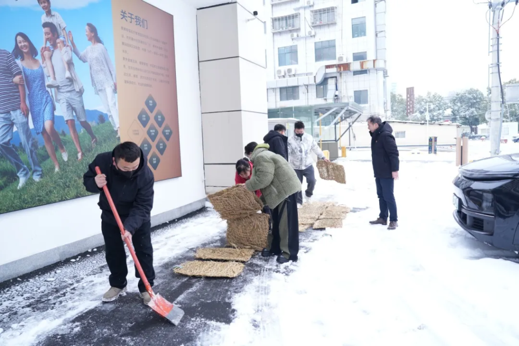 坚实的后勤是前线“战斗”的保障。采购部与综合服务部反应迅速,提前备足并及时铺设了大量草垫和沙包,重点覆盖公司出入口、台阶、坡道等关键易滑区域,筑起了牢固的防滑安全线。品宣部同事穿梭于除雪现场,用镜头捕捉下一幕幕感人瞬间:领导身先士卒的挥铲、志愿者额头沁出的汗珠、团队协作的默契身影、创新方法带来的效率提升……这些珍贵的影像,不仅记录了这场除雪战,更留存了中榈人团结拼搏、乐于奉献的精神风貌。